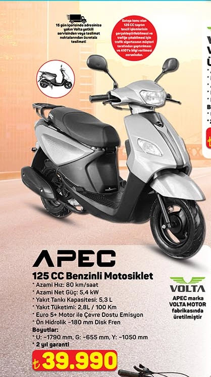 Bu hafta harika fırsatlar var! A101, 12 Şubat Perşembe günü gerçekleştireceği Aldın Aldın kampanyası ile sadece elektronik ürünlerle değil, aynı zamanda elektrikli ve benzinli ulaşım araçlarıyla da karşımıza çıkıyor. A101 12 Şubat Araç Kataloğu, Volta markasına ait elektrikli mopedler, elektrikli bisikletler ve APEC 125 cc benzinli motosiklet gibi çeşitli ürünlerle dolup taşıyor. Mutlaka göz atın!