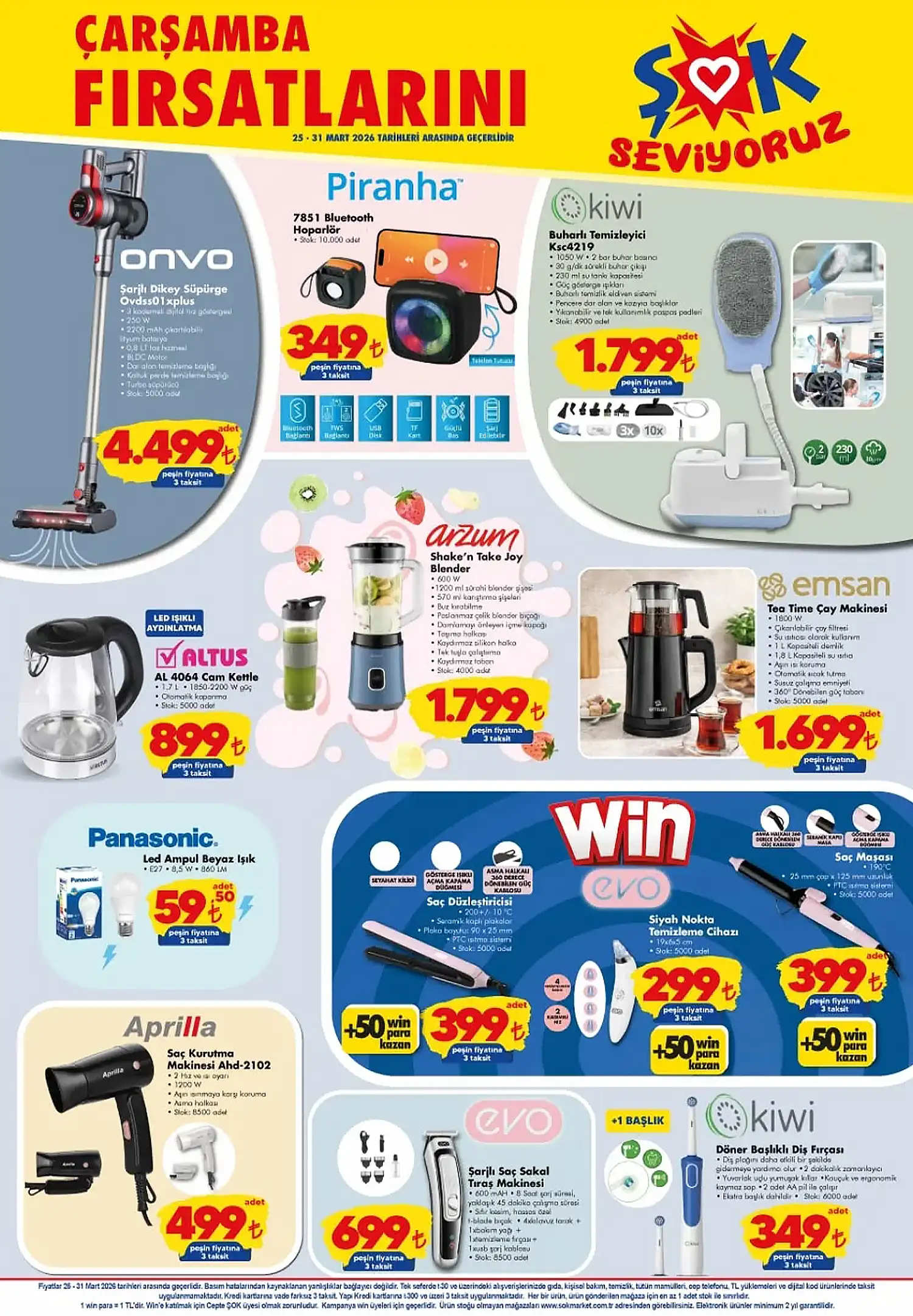 Kişisel bakım tarafında ise Win avantajlı ürünler dikkat çekiyor. Saç düzleştirici ve saç maşası ürünleri 399 TL fiyatla satışa sunulurken, bu alımlarda +50 TL Win puan kazanma fırsatı sunuluyor. Bu, ŞOK 25 Mart 2026 Aktüel Ürünler Kataloğu üzerinden yapılan alışverişlerin aslında daha da ucuza geldiğinin bir kanıtı.