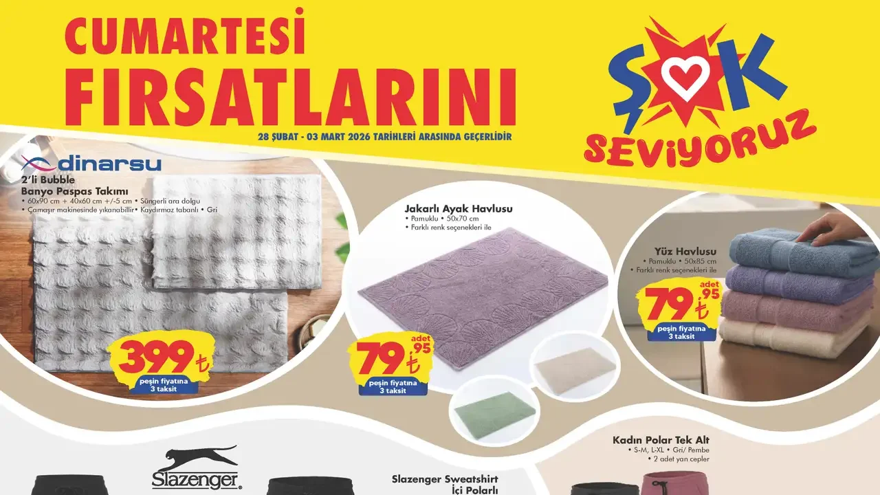 ŞOK 28 Şubat 2026 aktüel ürünler kataloğunda, bahar hazırlıklarını yapmak ve evdeki eşyaları düzenlemek isteyenler için mükemmel fırsatlar mevcut. Bu hafta, sadece gıda ve temizlik ürünleri değil, aynı zamanda evin temel ihtiyaçları üzerine odaklanılmış. İlk indirim sayfasında, Dinarsu banyo paspasları ve Slazenger tekstil ürünleri dikkat çekiyor. Slazenger eşofman altları ve polarlı sweatshirt’ler, spor mağazalarındaki etiketlerin çok altında fiyatlarla satışta! Bu da marka kalitesini ve ŞOK indirimini müthiş bir şekilde gözler önüne seriyor. Ayrıca, Letoon trekking ayakkabıları da 649 TL gibi cazip bir fiyata sunulmakta. Bu kadar uygun fiyata kaliteli ayakkabı bulmak neredeyse imkansızken, Letoon markalı ayakkabılar gerçekten harika bir kampanya!